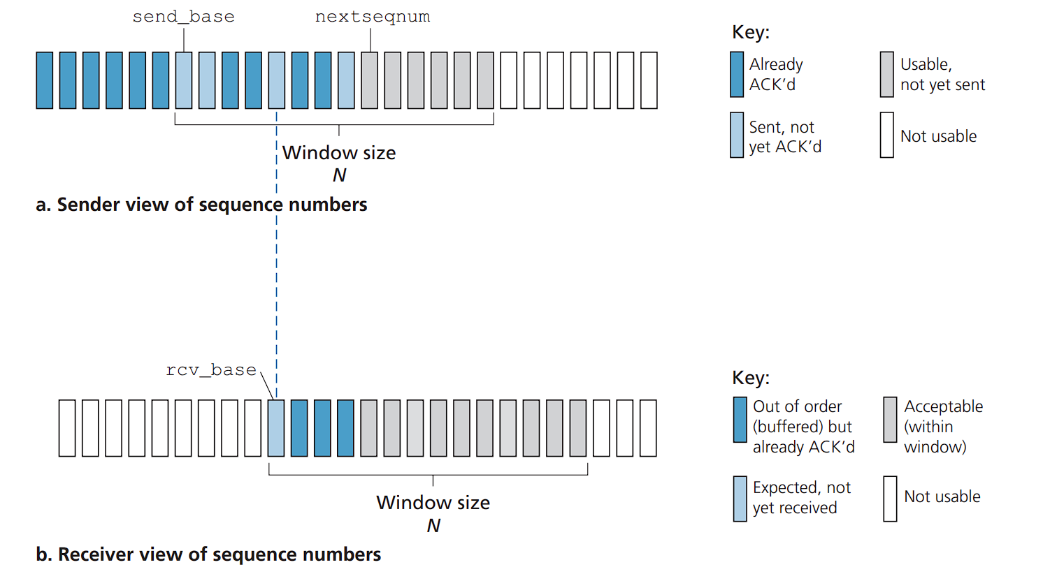 [0, base-1]:已发送并收到 ACK 的包的序号[base, nextseqsum-1]:已发送但并未收到 ACK 的包的序号[nextseqsum, base+N-1]:可用于待发送的包的序号