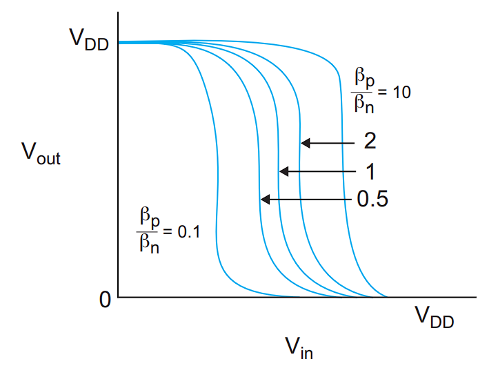 $\beta=\mu C_{ox}\frac{W}{L}$ 描述的是晶体管驱动能力的强弱。$\beta$ 越大,晶体管在相同栅压条件下能提供的电流就越大。如前所述,当 $\beta_n=\beta_p$ 时,反相器的阈值电压 $V_{inv}$ 恰好是 $V_{DD}/2$。