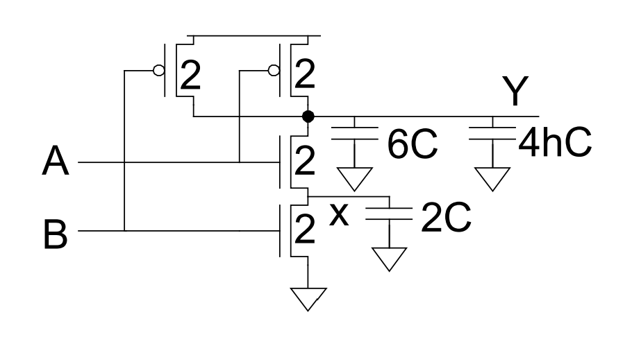 - 本级门的寄生电容:nMOS 漏扩散电容 $C$ 与 pMOS 漏扩散电容 $2C$