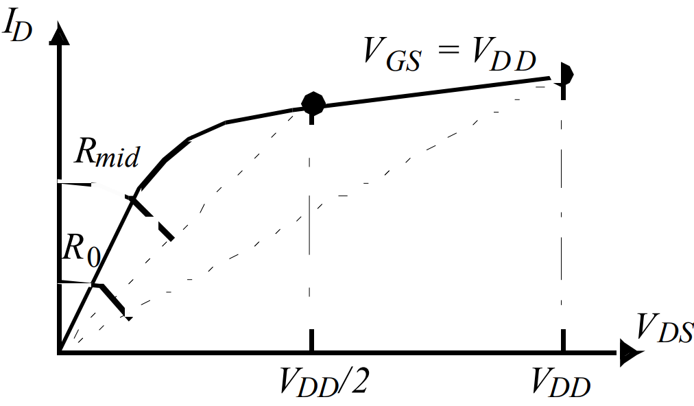 以计算一个理想反相器的有效导通电阻为例:给一个阶跃上升信号 $V_{GS}=V_{DD}$,导通的是 nMOS 晶体管: